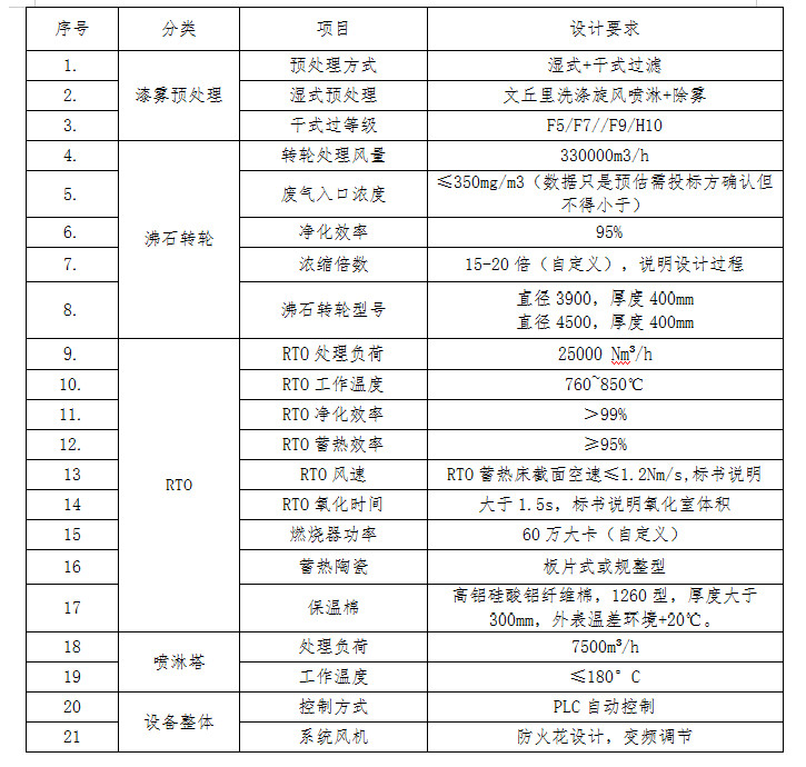 1、廢氣-2套濕式預處理系統+2套干式過濾系統+2套沸石轉輪+1套RTO系統+1套回風系統。