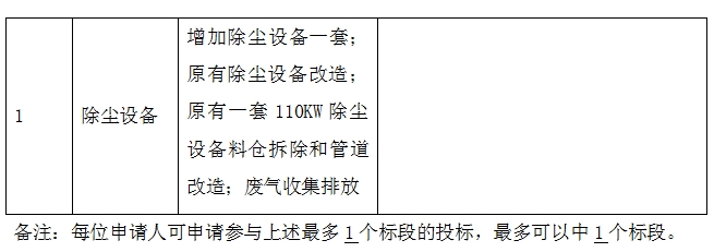 2、 工程(項目)規模:新增除塵設備一套;原有一套110KW除塵設備改造;廢氣收集排放,詳見招標內容;