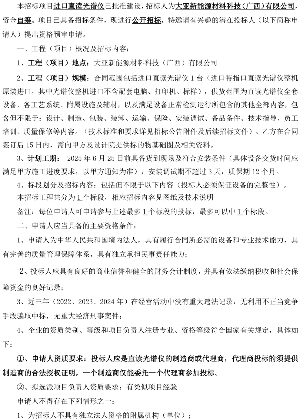 大亞新能源材料科技(廣西)有限公司進(jìn)口直讀光譜儀招標(biāo)公告