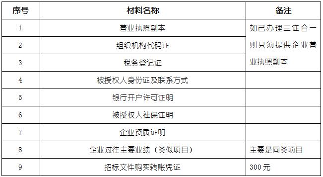 2、 凡有意向參加投標者,請在上述期間內按下表提供報名資料,相關證明文件的原件如無法提供原件則提供復印件加蓋公司公章,投標人須將上述資料的掃描件發郵件至招標聯系人處進行報名。