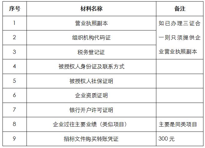 2、 凡有意向參加投標(biāo)者,請?jiān)谏鲜銎陂g內(nèi)按下表提供報(bào)名資料,相關(guān)證明文件的原件如無法提供原件則提供復(fù)印件加蓋公司公章,投標(biāo)人須將上述資料的掃描件發(fā)郵件至招標(biāo)聯(lián)系人處進(jìn)行報(bào)名。