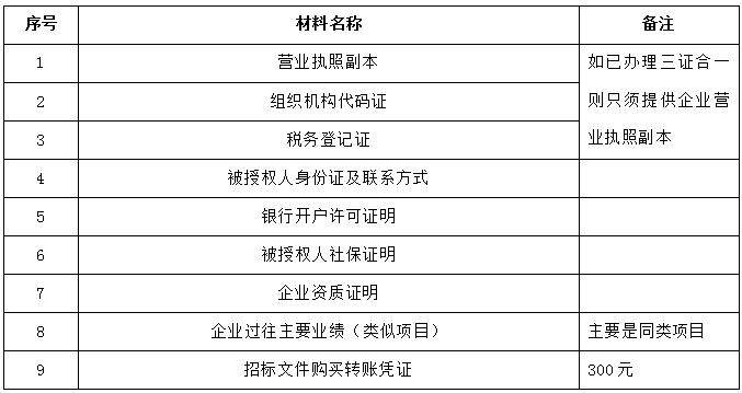 2、 凡有意向參加投標(biāo)者,請(qǐng)?jiān)谏鲜銎陂g內(nèi)按下表提供報(bào)名資料,相關(guān)證明文件的原件如無法提供原件則提供復(fù)印件加蓋公司公章,投標(biāo)人須將上述資料的掃描件發(fā)郵件至招標(biāo)聯(lián)系人處進(jìn)行報(bào)名。