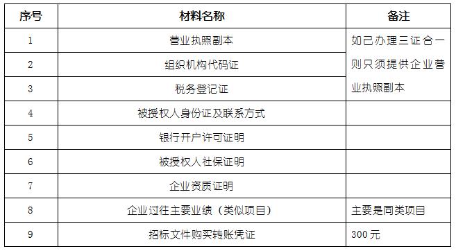 2、 凡有意向參加投標者,請在上述期間內按下表提供報名資料,相關證明文件的原件如無法提供原件則提供復印件加蓋公司公章,投標人須將上述資料的掃描件發郵件至招標聯系人處進行報名。