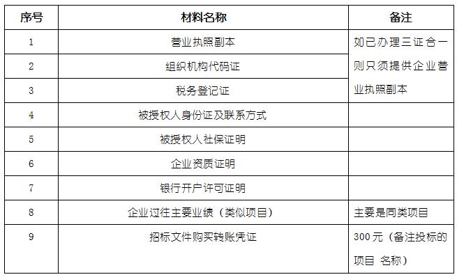 2、凡有意向參加投標者,請在上述期間內按下表提供報名資料,相關證明文件的原件如無法提供原件則提供復印件加蓋公司公章,投標人須將上述資料的掃描件發郵件至招標聯系人處進行報名。