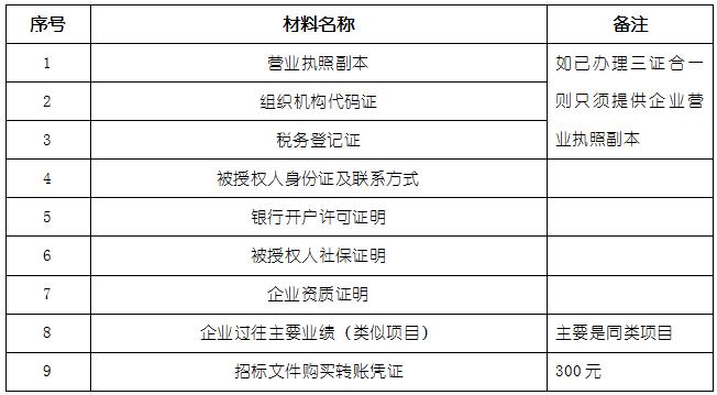 2、 凡有意向參加投標者,請在上述期間內按下表提供報名資料,相關證明文件的原件如無法提供原件則提供復印件加蓋公司公章,投標人須將上述資料的掃描件發郵件至招標聯系人處進行報名。