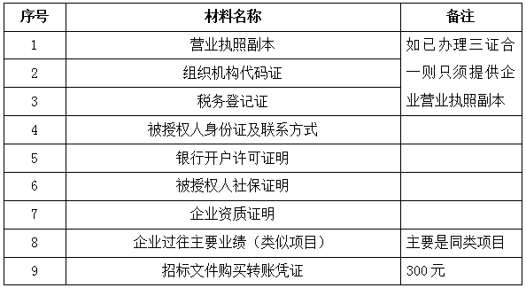 2、 凡有意向參加投標者,請在上述期間內按下表提供報名資料,相關證明文件的原件如無法提供原件則提供復印件加蓋公司公章,投標人須將上述資料的掃描件發郵件至招標聯系人處進行報名。