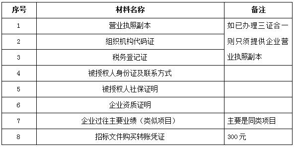 2、 凡有意向參加投標者,請在上述期間內按下表提供報名資料,相關證明文件的原件如無法提供原件則提供復印件加蓋公司公章,投標人須將上述資料的掃描件發郵件至招標聯系人處進行報名。