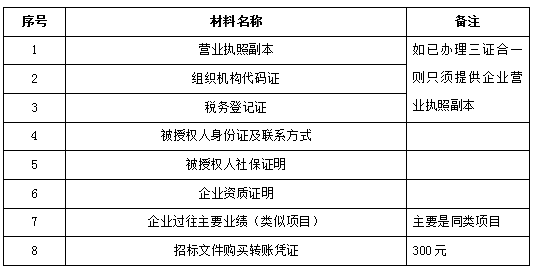 2、 凡有意向參加投標者,請在上述期間內按下表提供報名資料,相關證明文件的原件如無法提供原件則提供復印件加蓋公司公章,投標人須將上述資料的掃描件發郵件至招標聯系人郵箱進行報名。
