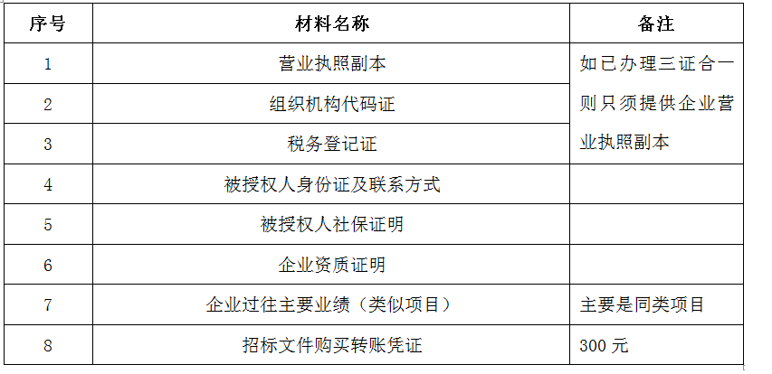 4、 獲取時間為本招標公告截止后,由招標人統一發放,本公告公示期間為:2020年9月28日12時起至2020年10月3日12時。凡有意向參加投標者,請在上述期間內按下表提供報名資料,相關證明文件的原件如無法提供原件則提供復印件加蓋公司公章,投標人須將上述資料的掃描件發郵件至招標聯系人處進行報名。