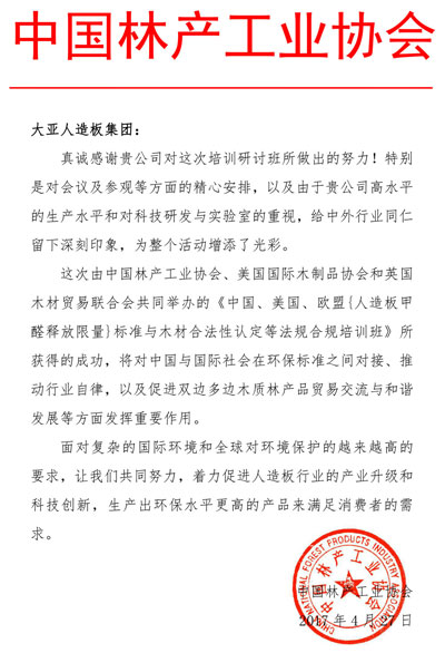中國(guó)林產(chǎn)工業(yè)協(xié)會(huì)致大亞人造板集團(tuán)的感謝信
