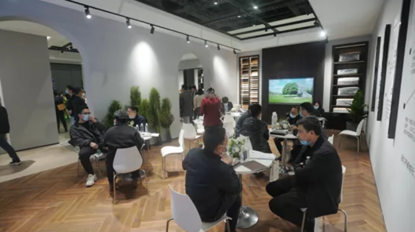 展館現(xiàn)場,圣象整裝設(shè)計+和圣象商用地材協(xié)同參展,全面展示了圣象多維立體產(chǎn)品架構(gòu)的體系模式。