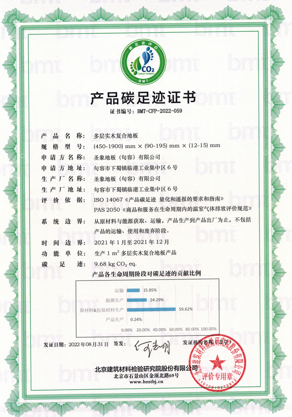 圣象地板(句容)有限公司,積極響應國家政策和行業發展趨勢,委托第三方基于生命周期評價方法開展產品碳足跡核算評價工作,助推企業控制和減少碳排放,實現綠色發展。