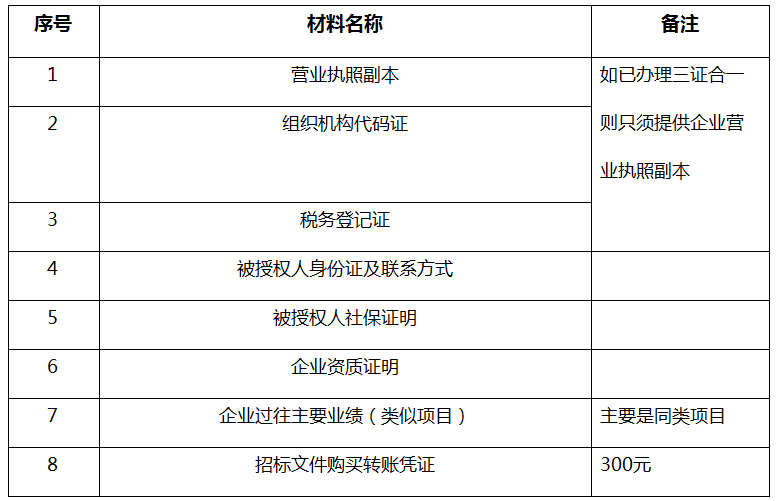 凡有意向參加投標者,請在上述期間內按下表提供報名資料,相關證明文件的原件如無法提供原件則提供復印件加蓋公司公章,投標人須將上述資料的掃描件發郵件至招標聯系人處進行報名。